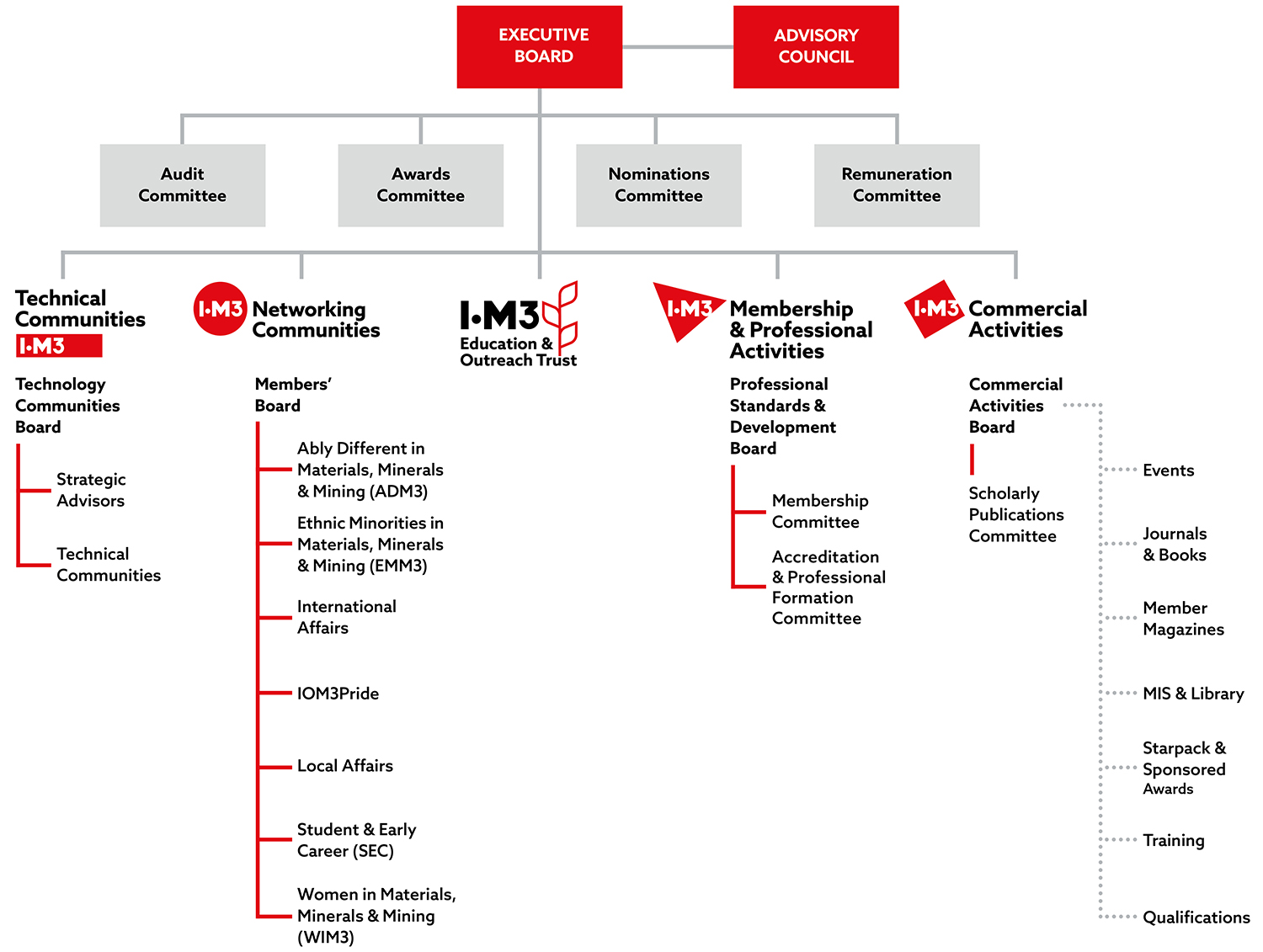 IOM3 is managed by an Executive Board, the members of which are Trustees of the Institute. They are drawn from senior members of the Institute and are responsible for the ongoing management of strategy and performance of the Institute. The members of the Board include those who are following presidential succession, and members involved as chairs of other activity boards.
