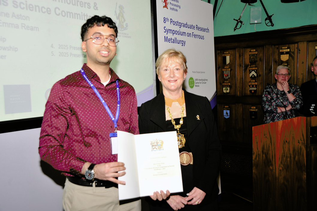 The panel of judges that I was part of (comprising representatives from the Armourers and Brasiers’ Company, MPI and IOM3), agreed that the standard of posters and presentations had been higher than ever this year. After some difficult deliberations, the Master of the Armourers & Brasiers’ Company, Professor Emma Ream, presented the best poster prize to Mohammed Siddiqui from the University of Leicester for his work entitled CFD modelling of the electric arc furnace process for sustainable steel. The runner up presentation prize was awarded to Lucy Fitzgerald from the University of Birmingham and the best presentation prize was to Megan Kendall from Swansea University. Finally, the 2025 Millman Scholar was announced as Molly Watson and the Ashok Kumar Fellowship was presented to Joe Greaves.