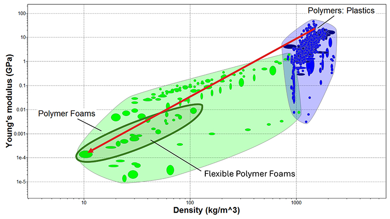 Hybrid materials allow a single material to have a much wider range of properties. This means that a single polymer could be extruded and drawn to create fibres that are much stiffer and stronger than the base polymer, or the polymer could be foamed to create a material that is much less stiff.