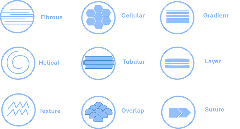 Gradient structures offer multiple properties by adjusting the ratios of the same components, texture provides protection against erosion and stops agents sticking into our materials, and fibrous and tubular structures provide strength.