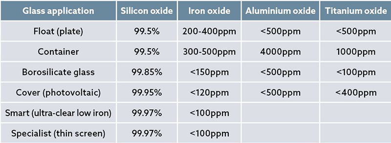 For glass applications, there are strict contaminant levels that must be adhered to. Iron content affects glass colour. More iron means more greenish tint. Aluminium, titanium and zirconium oxides cause problems with the melt and bubbles in the glass.