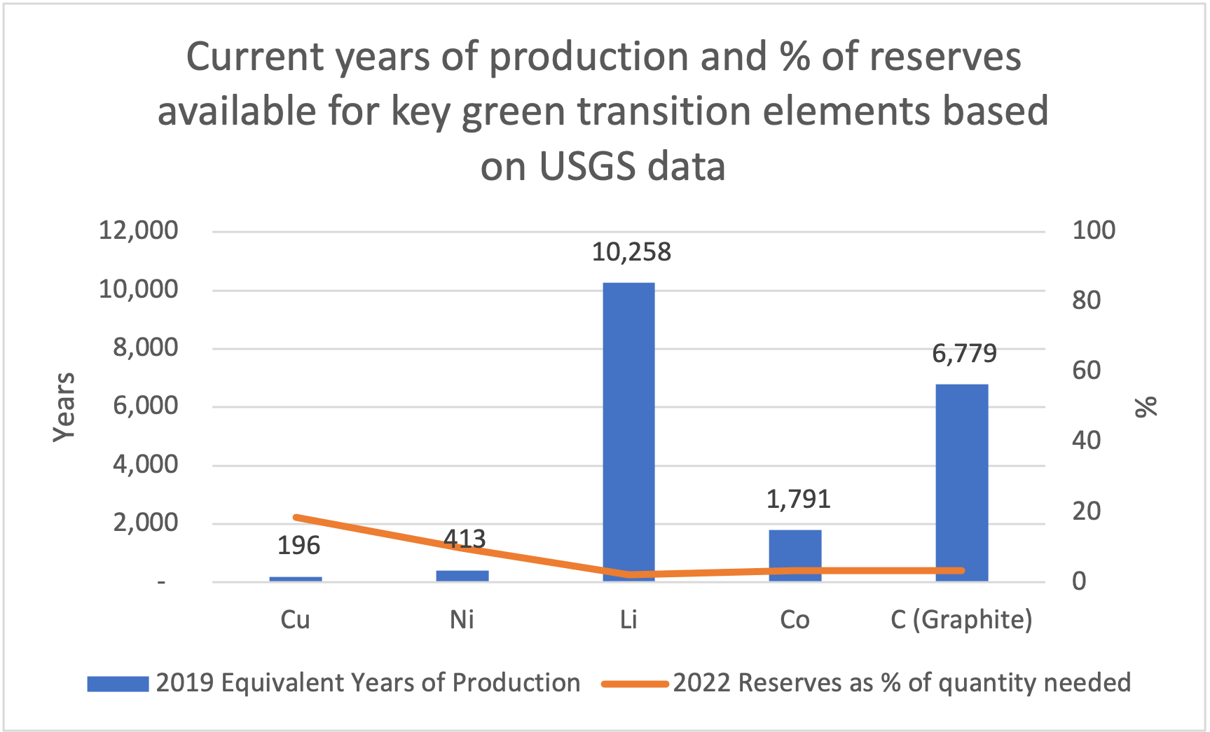 He uses recent global mineral statistics from the United States Geological Survey (USGS) to illustrate the scale of the issue (see graph below). This shows that if 2019 mine production figures are used, it will take between 196 years for copper and 10,258 years for lithium to deliver the quantities of metals required. However, production can be increased, assuming enough metals exist to be extracted.