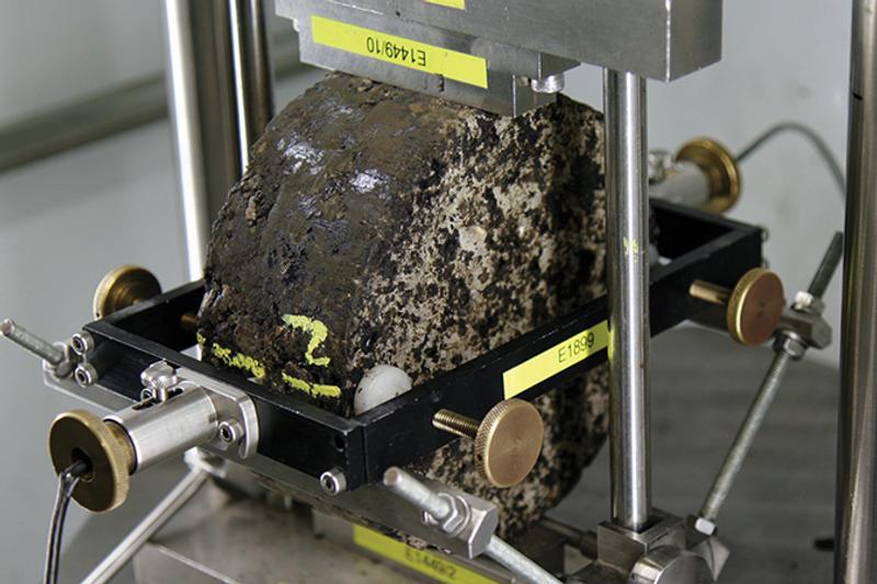 Another test involves taking a slab of material measuring 30cm in length and 50mm in thickness and tracking a wheel set at 20o backwards and forwards to mimic a heavy goods vehicle. 'If it’s a poor material, it will start to rip up and you’ll lose material from the surface,' Thom says.